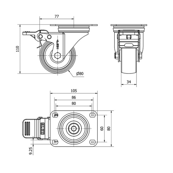 Rueda poliamix giratoria con freno Alex diametro 200 mm. 2-3634