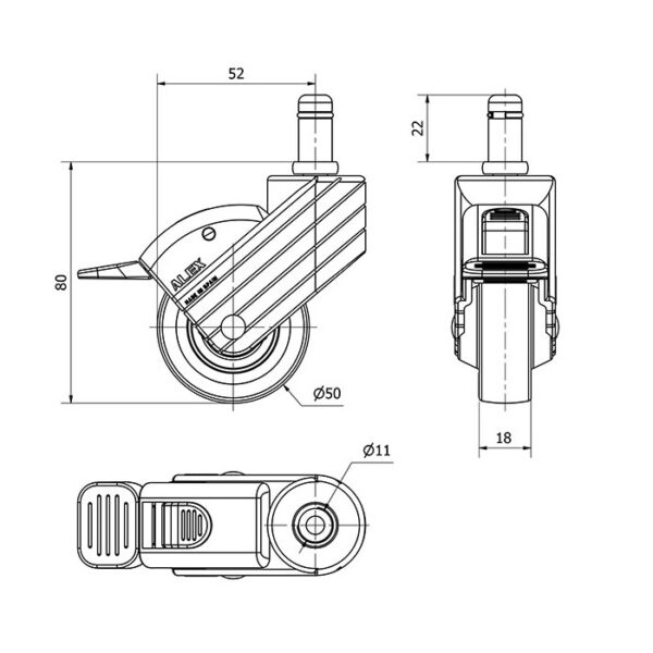 Rueda poliamix giratoria con freno Alex diametro 50 mm. modelo 1-0786