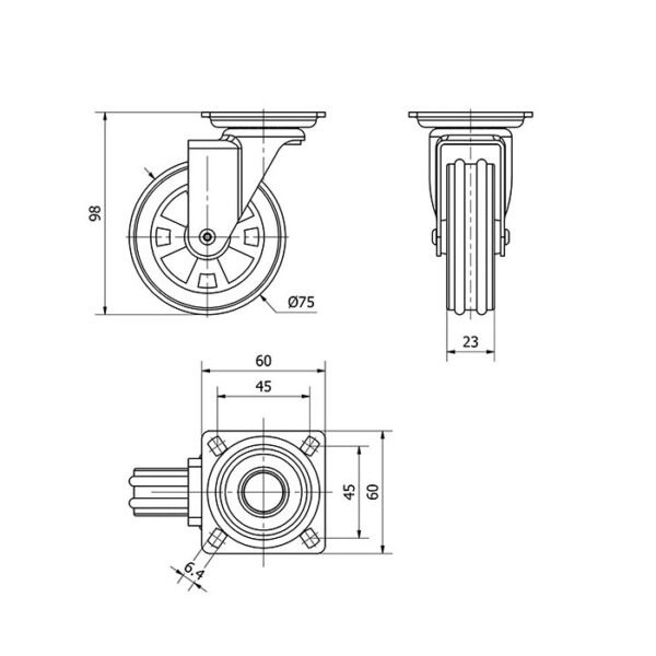 Rueda policarbonato giratoria Alex diametro 75 mm. modelo 1-0524