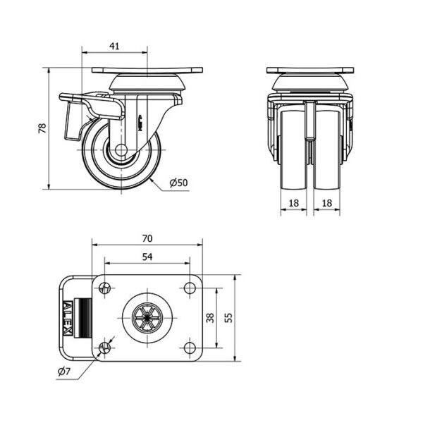 Rueda polipropileno-plastico giratoria con freno Alex diametro 50 mm. modelo 1-0390 EAN 8422202103907