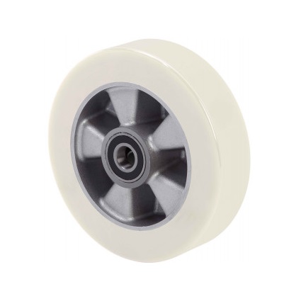 La serie de aros Alex AUSB son de poliuretano fundido blanco con dureza de banda de 88º shore A y gran capacidad de carga y de absorción de golpes. Adecuada para desplazamientos en velocidad hasta 16 Km./h. Cargas recomendadas según velocidad: (6 Km/h. -20%), (10 Km/h. -40%), (16 Km/h. -60%).