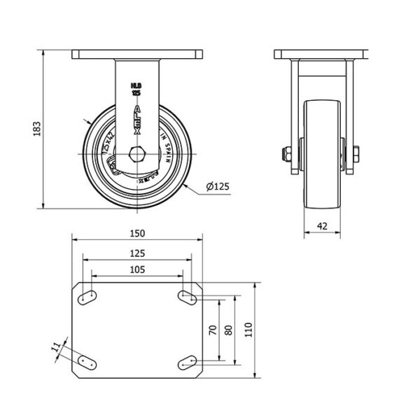 Rueda poliuretano fija Alex diametro 125 mm. modelo 2-0493