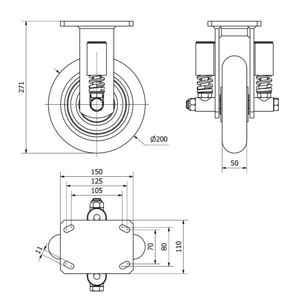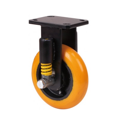 Rueda poliuretano fija Alex diametro 200 mm. modelo 2-3545 EAN 8422202235455 n nHOJA TECNICA n nLas ruedas Alex serie HLS-HUAB son ruedas con el núcleo de acero y banda de poliuretano fundido con dureza de 95? shore A, con banda de rodadura en forma balona, indicadas para soportar altas cargas hasta 800 Kg. Con soporte de suspensión elástica mediante incorporación de muelle muy resistente, ideal en suelos irregulares donde su amortiguación actúa. Se utilizan en útiles de transporte logístico, gradas móviles, maquinaria pesada, plataformas elevadoras, grúas móviles y maquinaria pesada del sector de la construcción, principalmente en el sector aeronáutico, ferroviario y automoción. HUAB: Maxima maniobrabilidad. Alta absorción de los golpes. Condiciones de pavimento desfavorables. Superficies rugosas, quebradas, con virutas metálicas, manchas de aceite, cristales, grasas y grava.