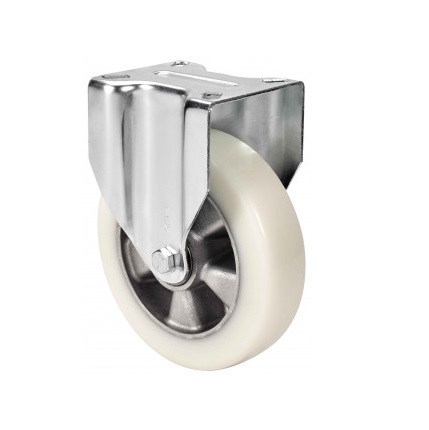 La serie de ruedas Alex ZVR-AUSB son de ruedas con el núcleo de aluminio y la banda de poliuretano blanco de dureza 88º shore A, indicadas para soportar altas cargas hasta 650 Kg. Se utilizan en útiles de logística interna, talleres, carros de herramientas, contenedores, transporte industrial, gradas móviles, útiles de transporte, empresas de alimentación, barredoras, pulidoras, maquinaria pesada, grúas móviles, mesas elevadoras, caldererías y contenedores. AUSB: Recomendada para desplazamientos en velocidad (hasta 16 Km./h). Alta absorción de los golpes. Condiciones de pavimento desfavorables. Superficies rugosas, quebradas, con virutas metálicas, manchas de aceite, cristales, grasas, grava.