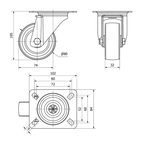 Rueda poliuretano fija Alex diametro 80 mm. modelo TW0211 EAN 8422202002118