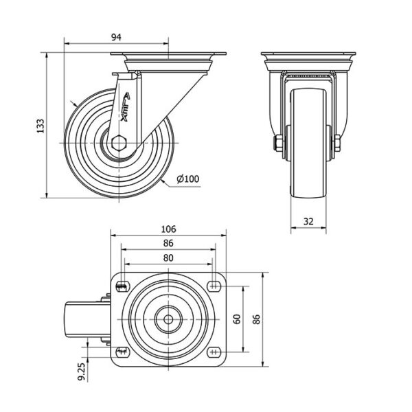 Rueda poliuretano giratoria Alex diametro 100 mm. modelo 2-2930