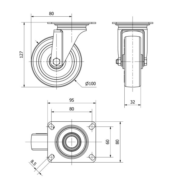 Rueda poliuretano giratoria Alex diametro 100 mm. modelo 2-3093