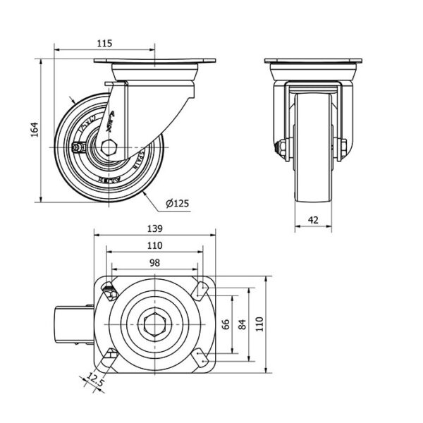 Rueda poliuretano giratoria Alex diametro 125 mm. modelo 2-0313 EAN 8422202203133