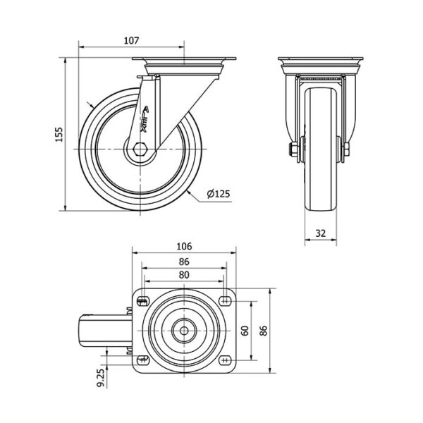 Rueda poliuretano giratoria Alex diametro 125 mm. modelo 2-2419