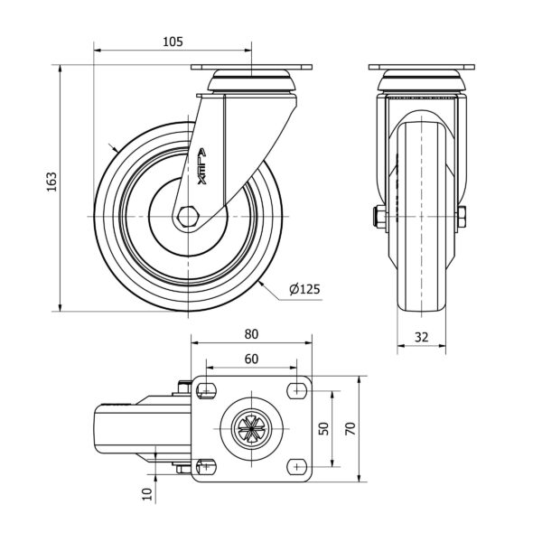 Rueda poliuretano giratoria Alex diametro 125 mm. modelo 2-2463