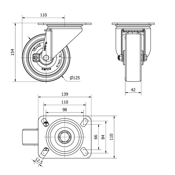 Rueda poliuretano giratoria Alex diametro 125 mm. modelo 2-3709 EAN 8422202237091