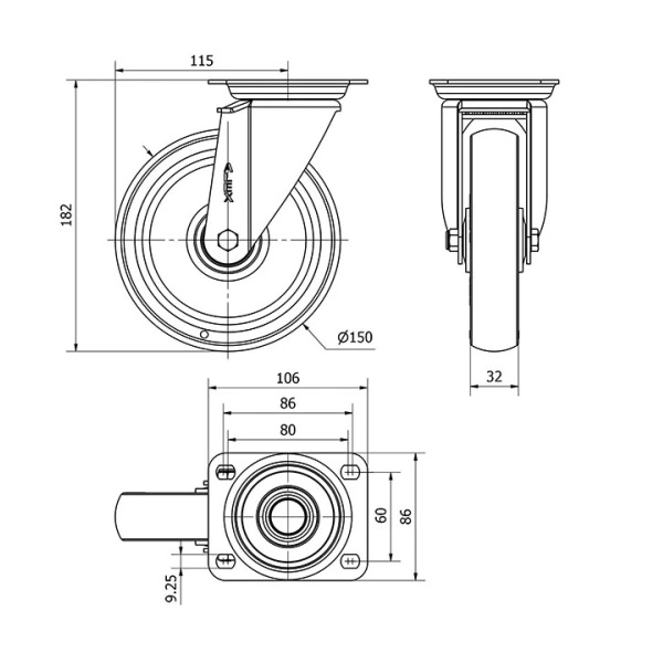 Rueda poliuretano giratoria Alex diametro 150 mm. 2-0589
