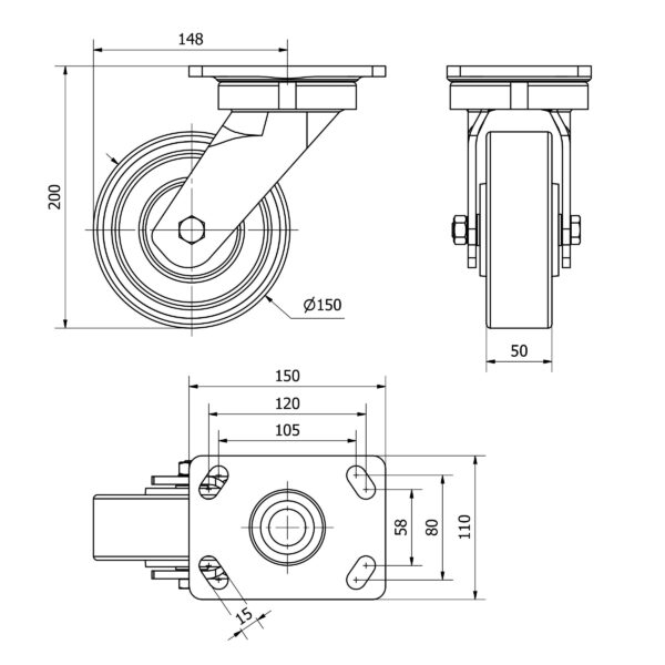 Rueda poliuretano giratoria Alex diametro 150 mm. 4-0150