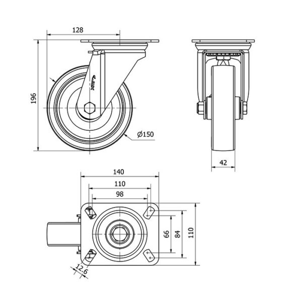 Rueda poliuretano giratoria Alex diametro 150 mm. modelo 2-2840