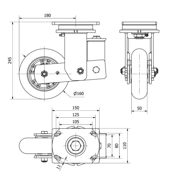 Rueda poliuretano giratoria Alex diametro 160 mm. modelo 2-4400