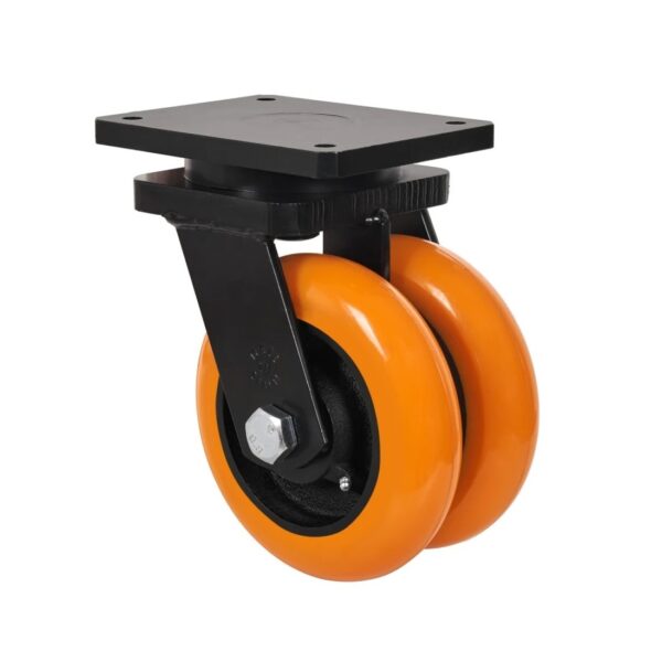 Rueda doble con núcleo de acero y banda de poliuretano fundido con dureza de 95? shore A, especialmente indicada para soportar altas cargas de hasta 1.600 Kg.