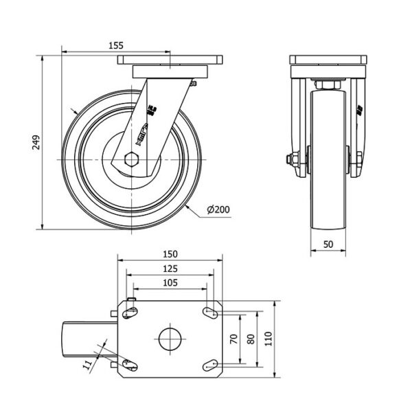 Rueda poliuretano giratoria Alex diametro 200 mm. modelo 2-0487