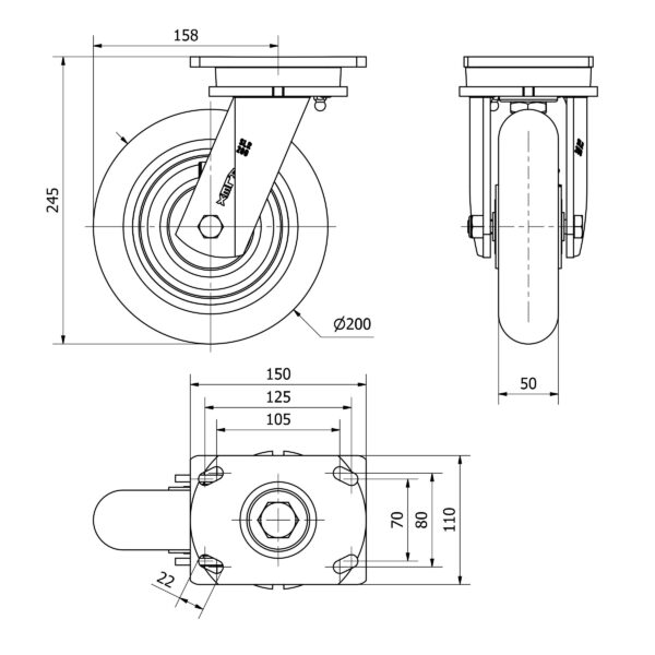 Rueda poliuretano giratoria Alex diametro 200 mm. modelo 2-3725
