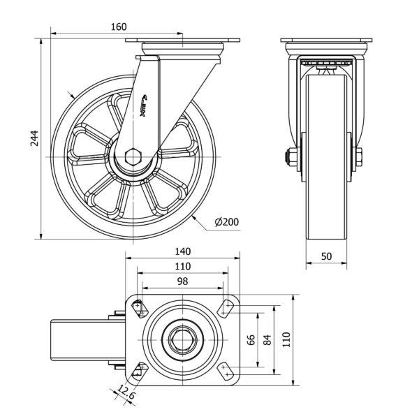 Rueda poliuretano giratoria Alex diametro 200 mm. modelo 2-3853
