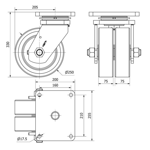 Rueda poliuretano giratoria Alex diametro 250 mm. modelo 2-3590