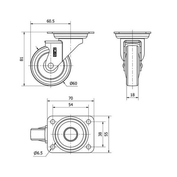 Rueda poliuretano giratoria Alex diametro 60 mm. modelo 1-0731