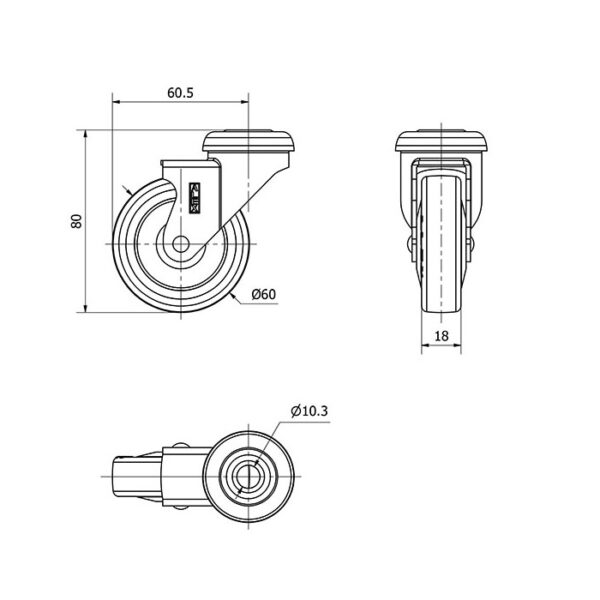 Rueda poliuretano giratoria Alex diametro 60 mm. modelo 1-0749
