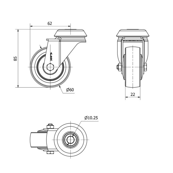 Rueda poliuretano giratoria Alex diametro 60 mm. modelo 2-2525