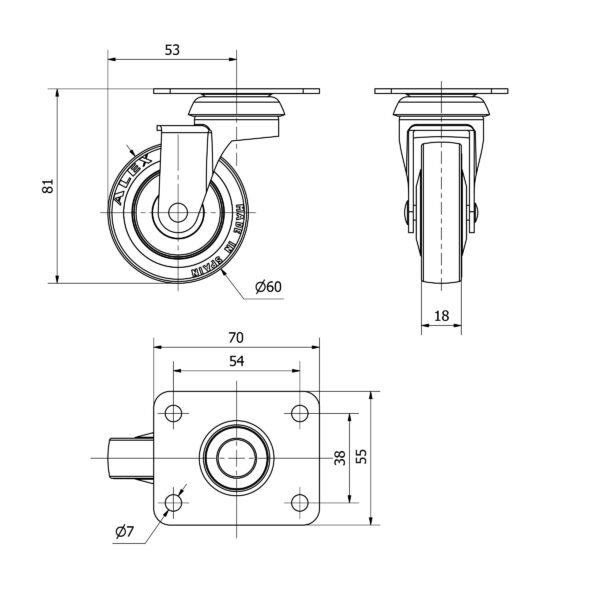 Rueda poliuretano giratoria Alex diametro 60 mm. modelo 2-2566