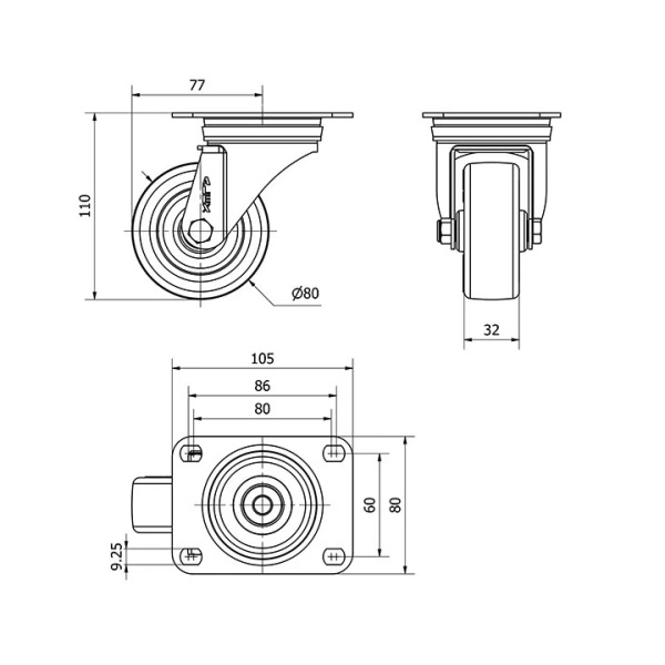 Rueda poliuretano giratoria Alex diametro 80 mm. 2-0328