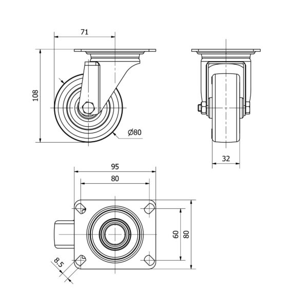 Rueda poliuretano giratoria Alex diametro 80 mm. modelo 2-3092