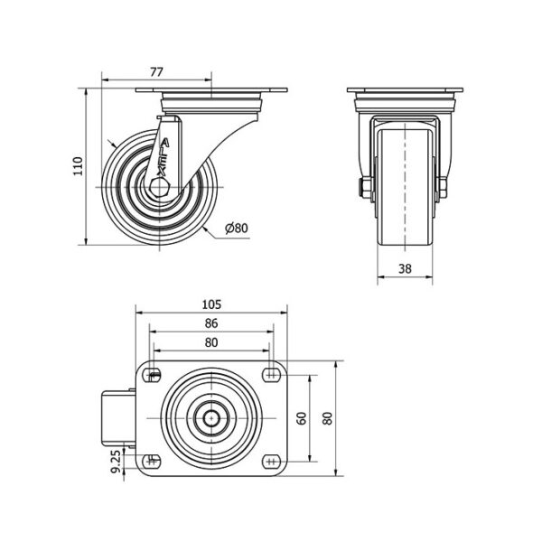 Rueda poliuretano giratoria Alex diametro 80 mm. modelo 2-4652