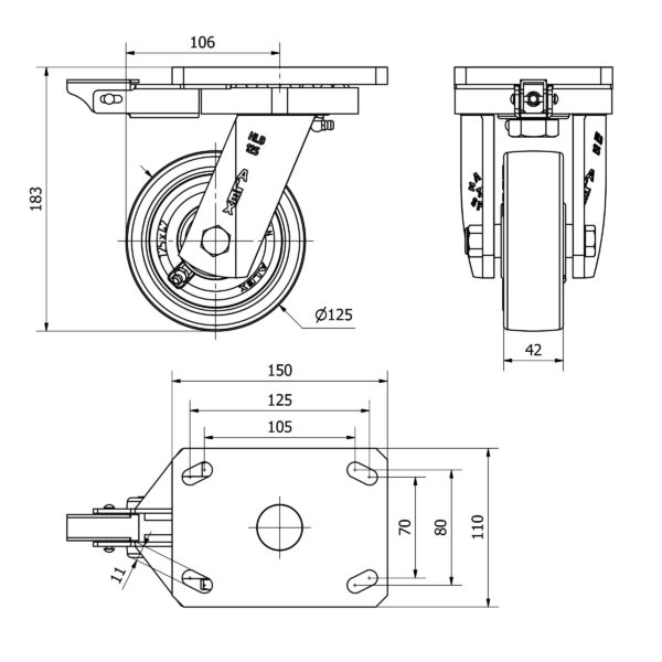 Rueda poliuretano giratoria con bloqueo direccional Alex diametro 125 mm. 2-3362