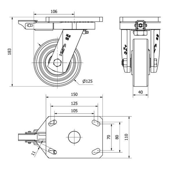 Rueda poliuretano giratoria con bloqueo direccional Alex diametro 125 mm. 2-3368