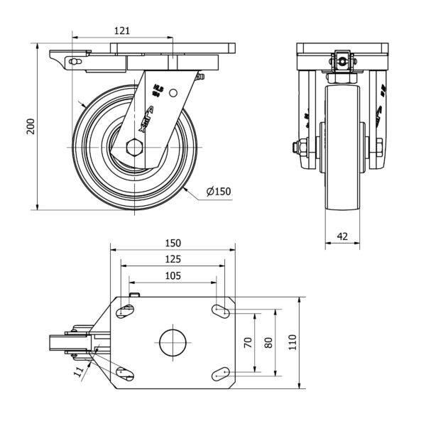 Rueda poliuretano giratoria con bloqueo direccional Alex diametro 150 mm. modelo 2-3363 EAN 8422202233635