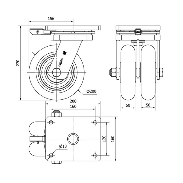 Rueda doble con núcleo de acero y banda de poliuretano fundido con dureza de 95? shore A, especialmente indicada para soportar altas cargas de hasta 1.600 Kg.
