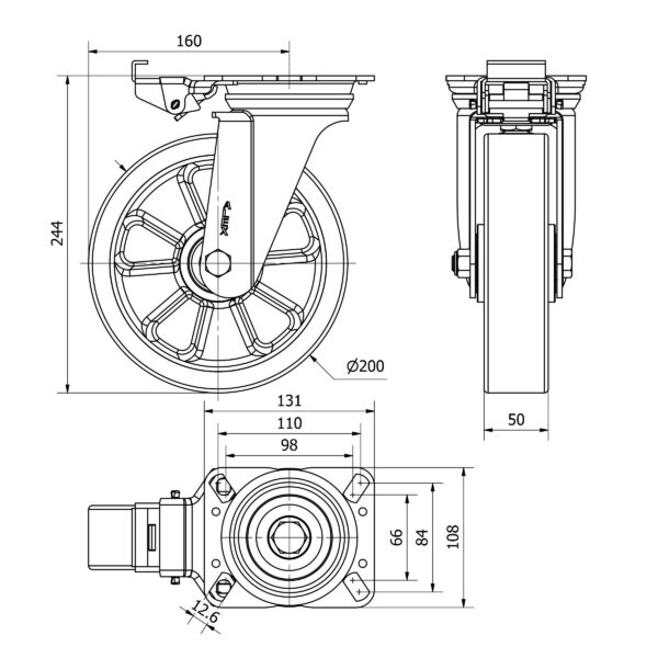 Rueda poliuretano giratoria con bloqueo direccional Alex diametro 200 mm. modelo 2-3856
