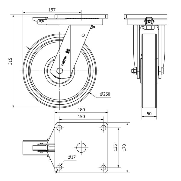 Rueda poliuretano giratoria con bloqueo direccional Alex diametro 250 mm. modelo 2-3372