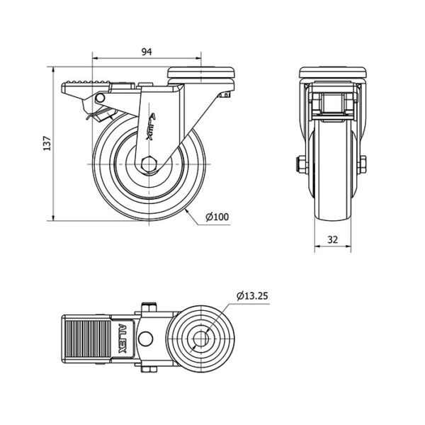 Rueda poliuretano giratoria con freno Alex diametro 100 mm. modelo 2-1217