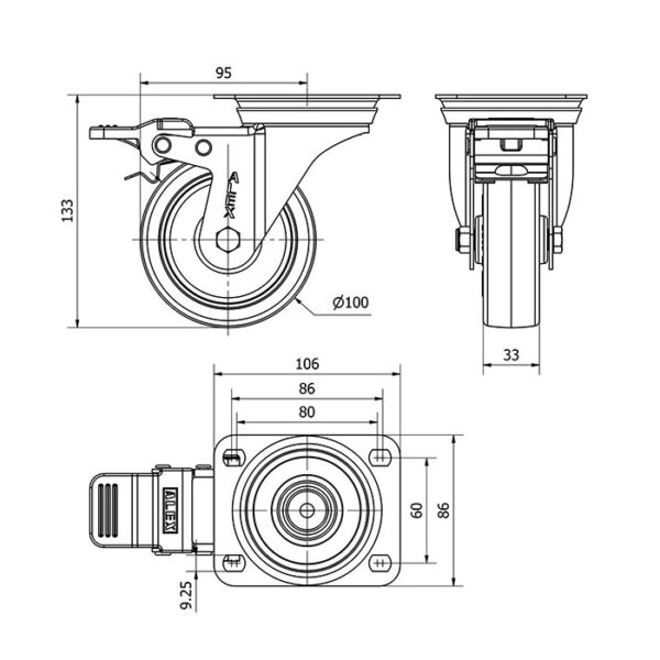 Rueda poliuretano giratoria con freno Alex diametro 100 mm. modelo 2-1652
