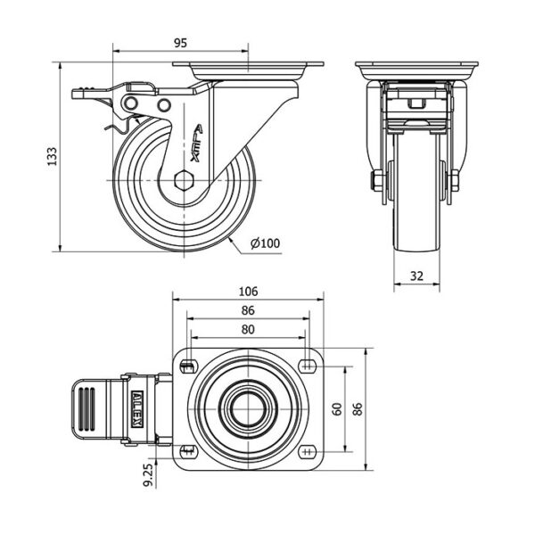 Rueda poliuretano giratoria con freno Alex diametro 100 mm. modelo 2-2831 EAN 8422202228310