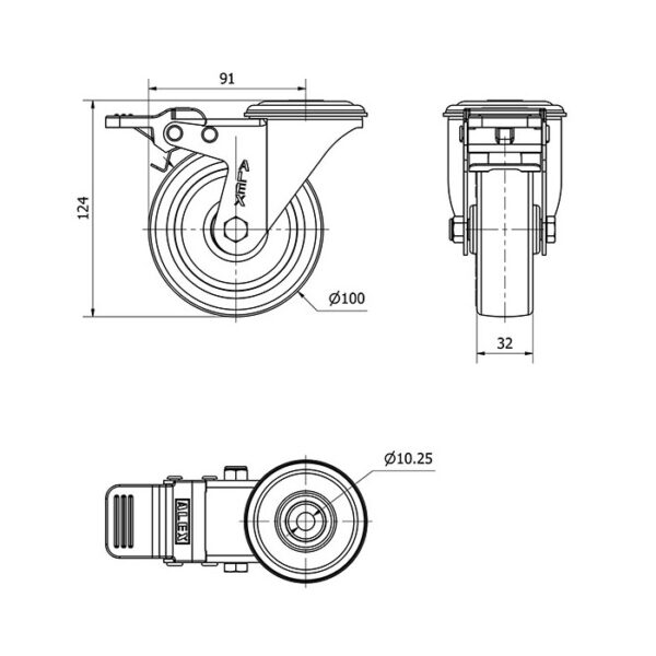 Rueda poliuretano giratoria con freno Alex diametro 100 mm. modelo 2-2864
