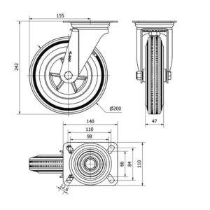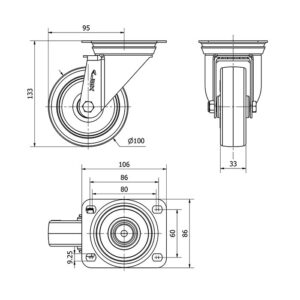 Rueda poliuretano giratoria con freno Alex diametro 100 mm. modelo 2-3058 EAN 8422202230580