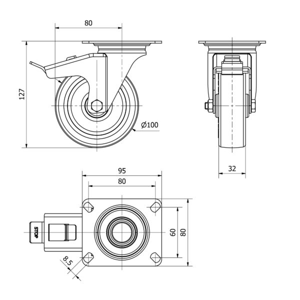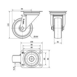 Rueda poliuretano giratoria con freno Alex diametro 100 mm. modelo 2-3099 EAN 8422202230993
