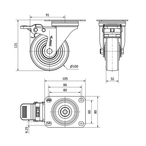 Rueda poliuretano giratoria con freno Alex diametro 100 mm. modelo 2-4210