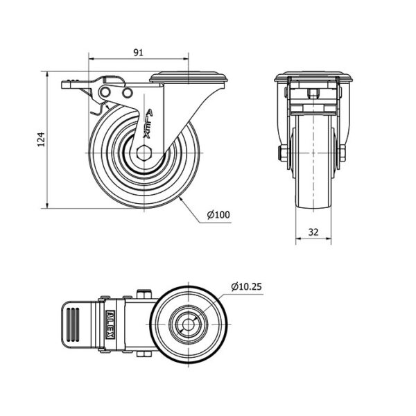 Rueda poliuretano giratoria con freno Alex diametro 100 mm. modelo 2-4234