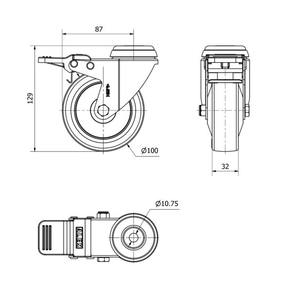Rueda poliuretano giratoria con freno Alex diametro 100 mm. modelo 2-4677