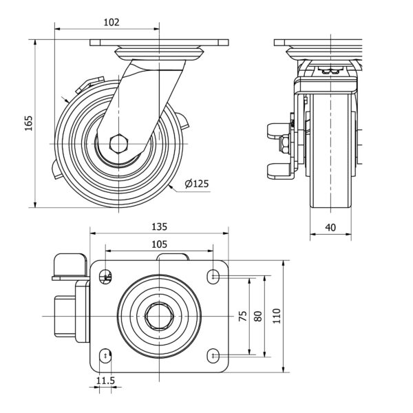 Rueda poliuretano giratoria con freno Alex diametro 125 mm. 4-1217