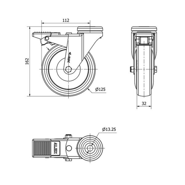 Rueda poliuretano giratoria con freno Alex diametro 125 mm. modelo 2-1600