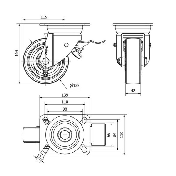 Rueda poliuretano giratoria con freno Alex diametro 125 mm. modelo 2-1615