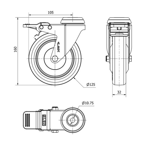 Rueda poliuretano giratoria con freno Alex diametro 125 mm. modelo 2-2472